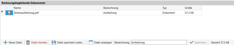 Bei der Rechnungserstellung lassen sich zu der E-Rechnung rechnungsbegleitende Dokumente, wie z.B. Stundenauflistungen,Beschreibungen zu durchgeführten Arbeiten etc, hinzufügen. NICHT zu den Dokumenten zählen Lieferscheine, Angebote, Rechnungen etc.
