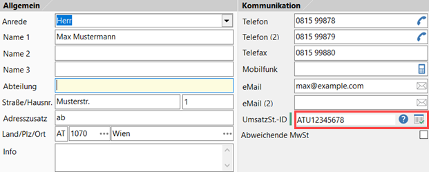 In der Lieferanschrift lässt sich eine Umsatzsteueridendentnummer angeben, die – je nach Einstellung – beim Zufügen der Lieferadresse zu einem Vorgang die Umsatzsteueridentnummer der Rechnungsadresse ersetzt. Dadurch ist es möglich, einer Rechnungsadresse über die Lieferadresse unterschiedliche Umsatzsteueridentnummern zuzuweisen. Folgende Voraussetzungen müssen erfüllt sein, damit die Umsatzsteueridentnummer in den Vorgang übernommen wird: