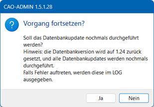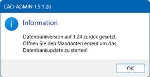 Es wird danach darauf hingewiesen das die Datenbankversion zurückgesetzt ist und der Mandant erneut geöffnet werden muss.