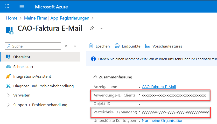 Nachdem die App registriert wurde, notieren Sie sich die Anwendungs-ID und die Verzeichnis-ID. Diese Angaben werden für die Einrichtung der Email in den allgemeinen Einstellungen benötigt.