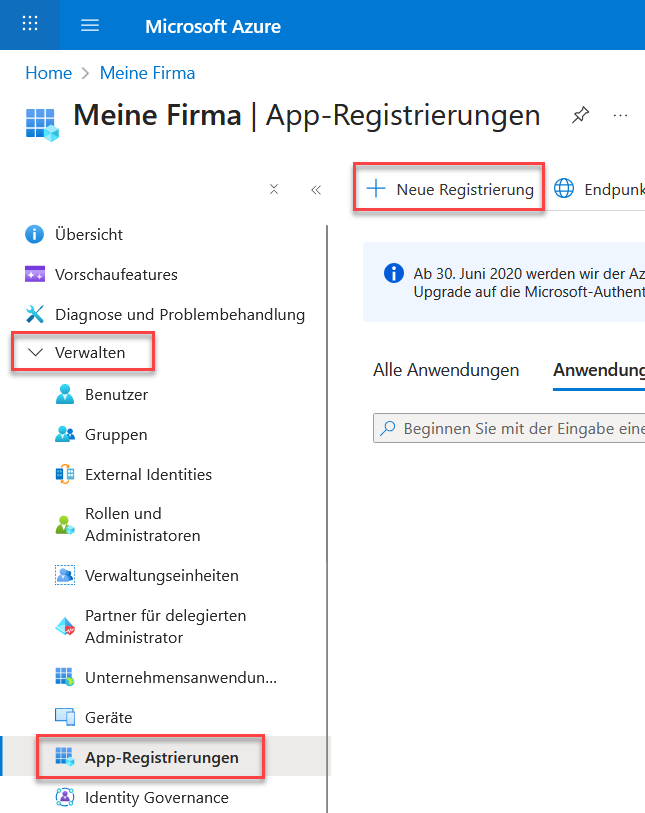 Wählen Sie dann unter Verwalten App-Registrierungen -> Neue Registrierung aus.