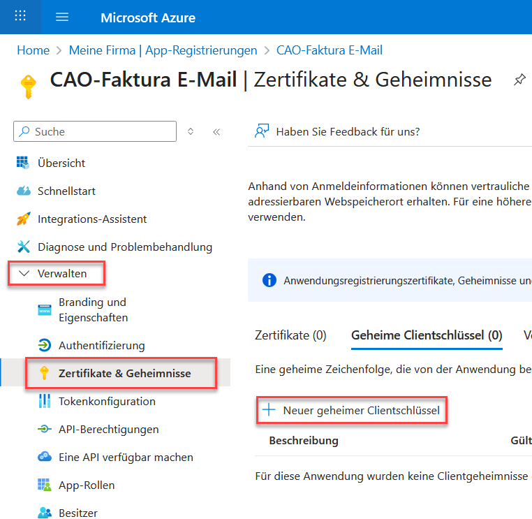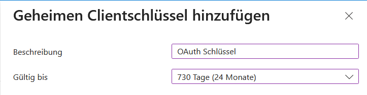 Zusätzlich wird ein geheimer Clientschlüssel benötigt. Dazu wählen Sie Verwalten / Zertifikate & Geheimnisse und legen über Neuer geheimer Clientschlüssel den Schlüssel an.
