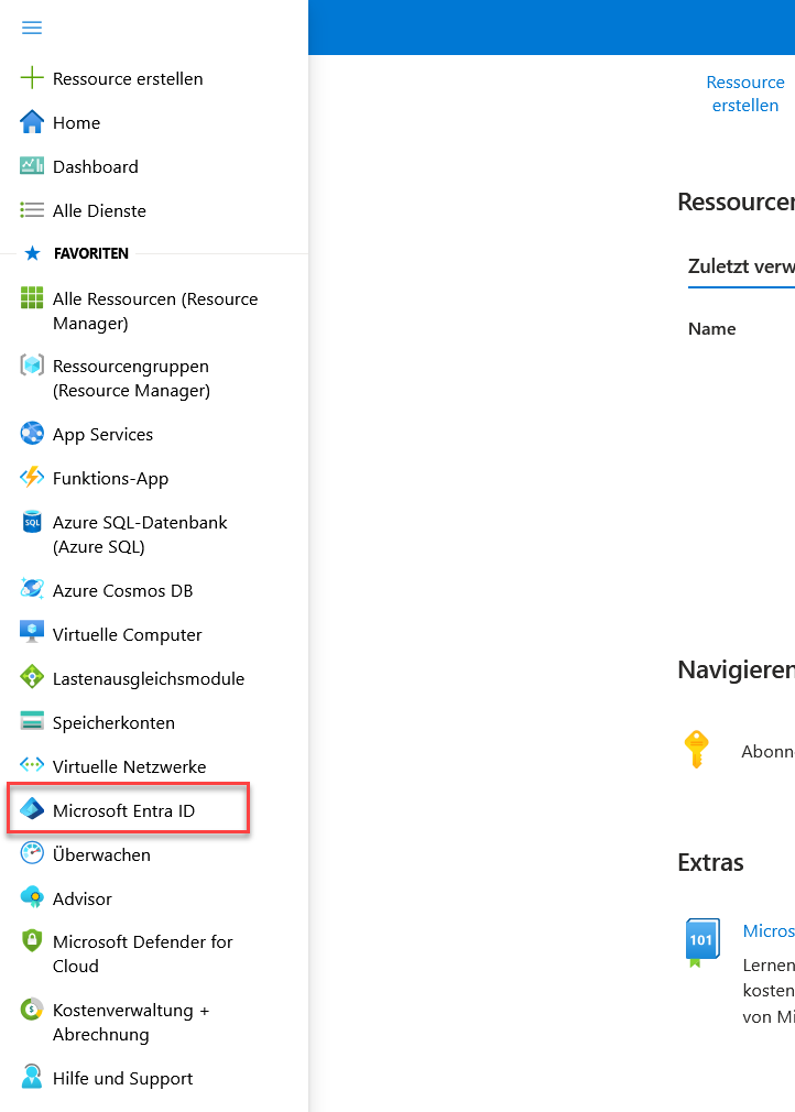Melden Sie sich als Administrator im Azure Portal an und wählen im linken Menü Mirosoft Entra ID aus oder geben in der Suchleiste "entra" ein.